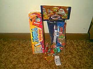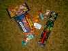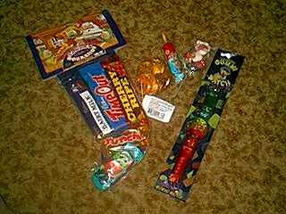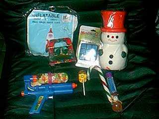 lollies, immitation Rubic's Cube, snowman candle, misc candies,